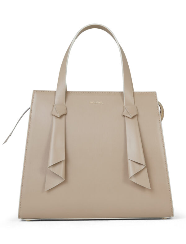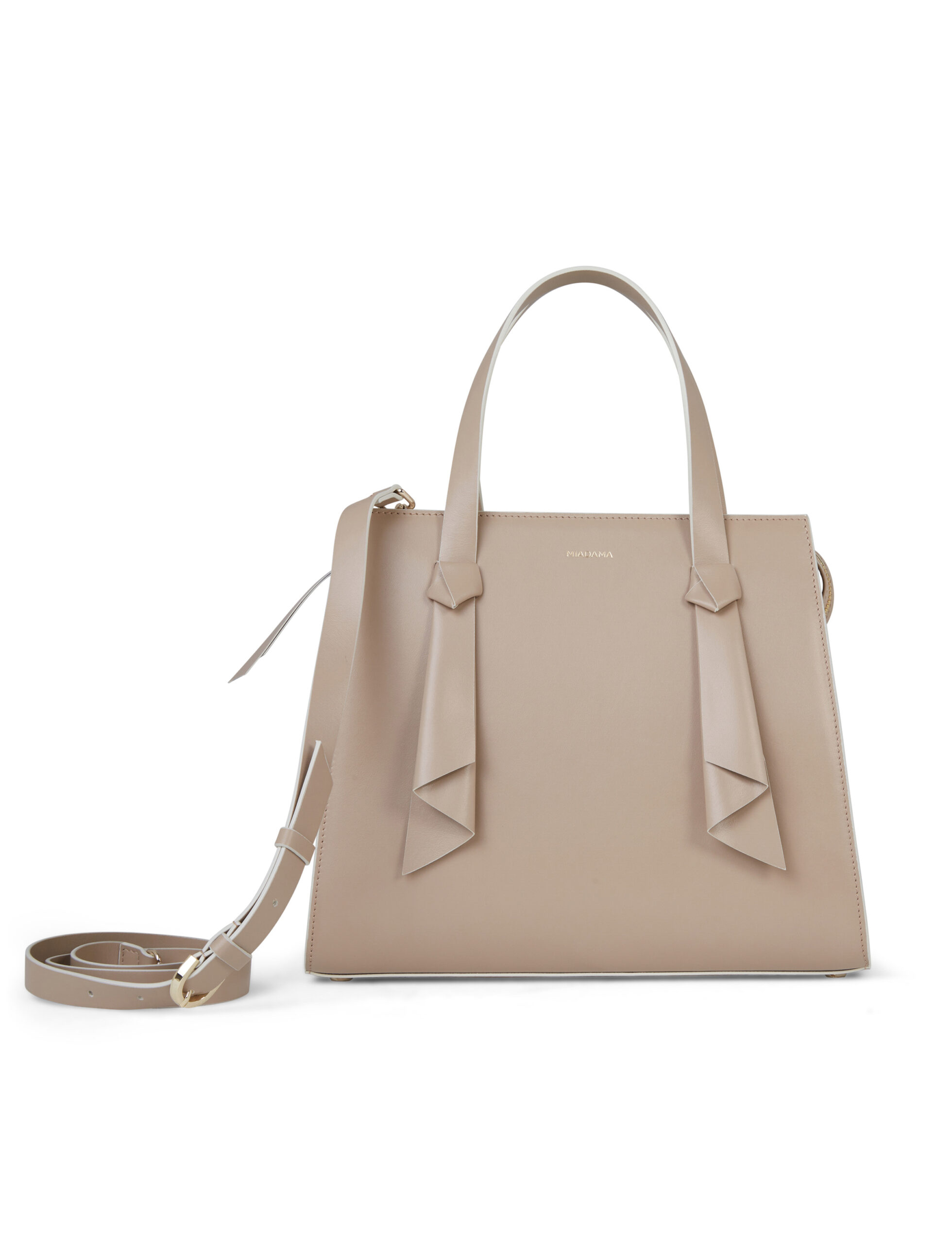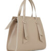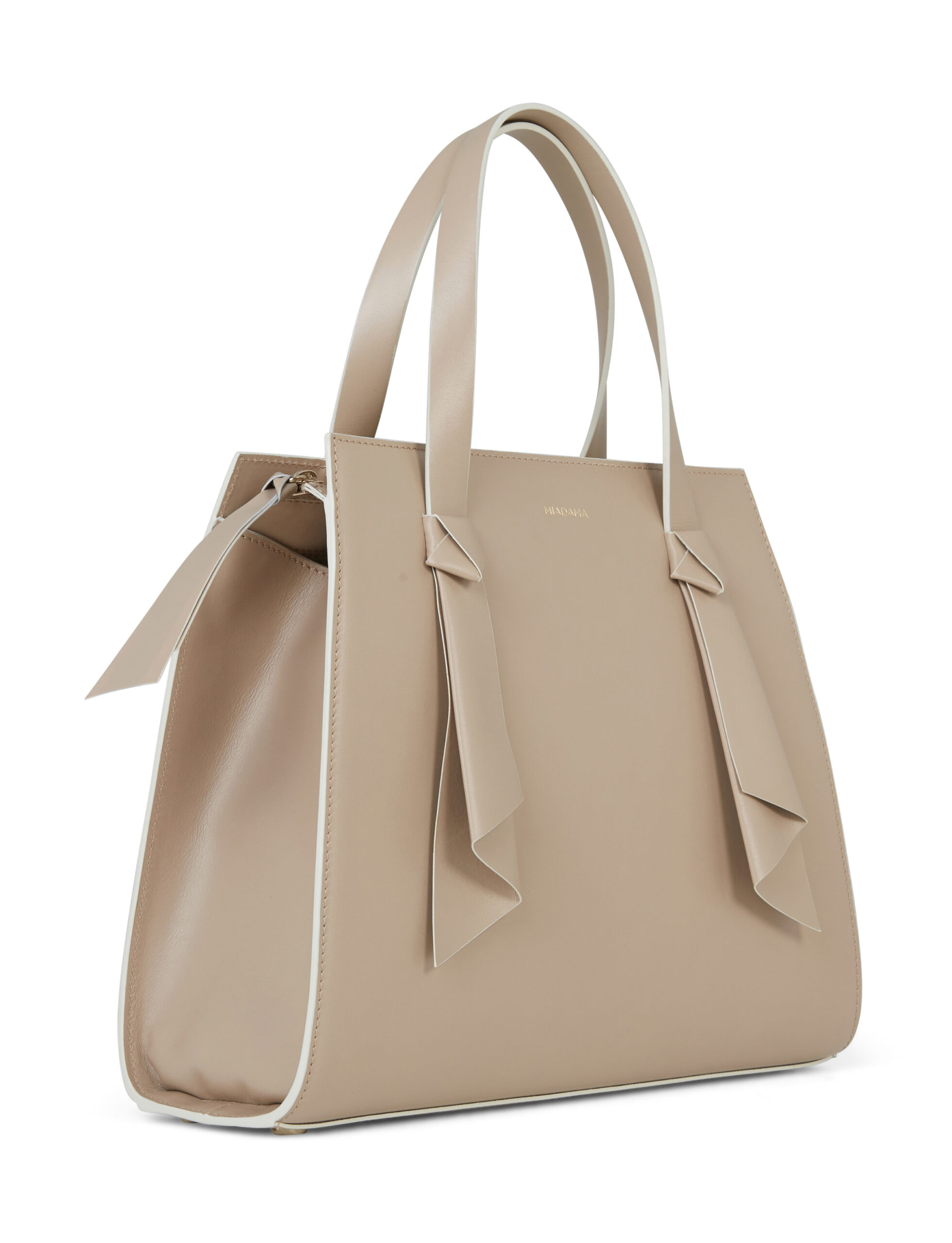 Borsa a mano in pelle di vitello liscio colore cappuccino. Tracolla in pelle regolabile. Fodera in cotone colore beige. Accessori oro chiaro. Bordi a contrasto colore panna.