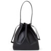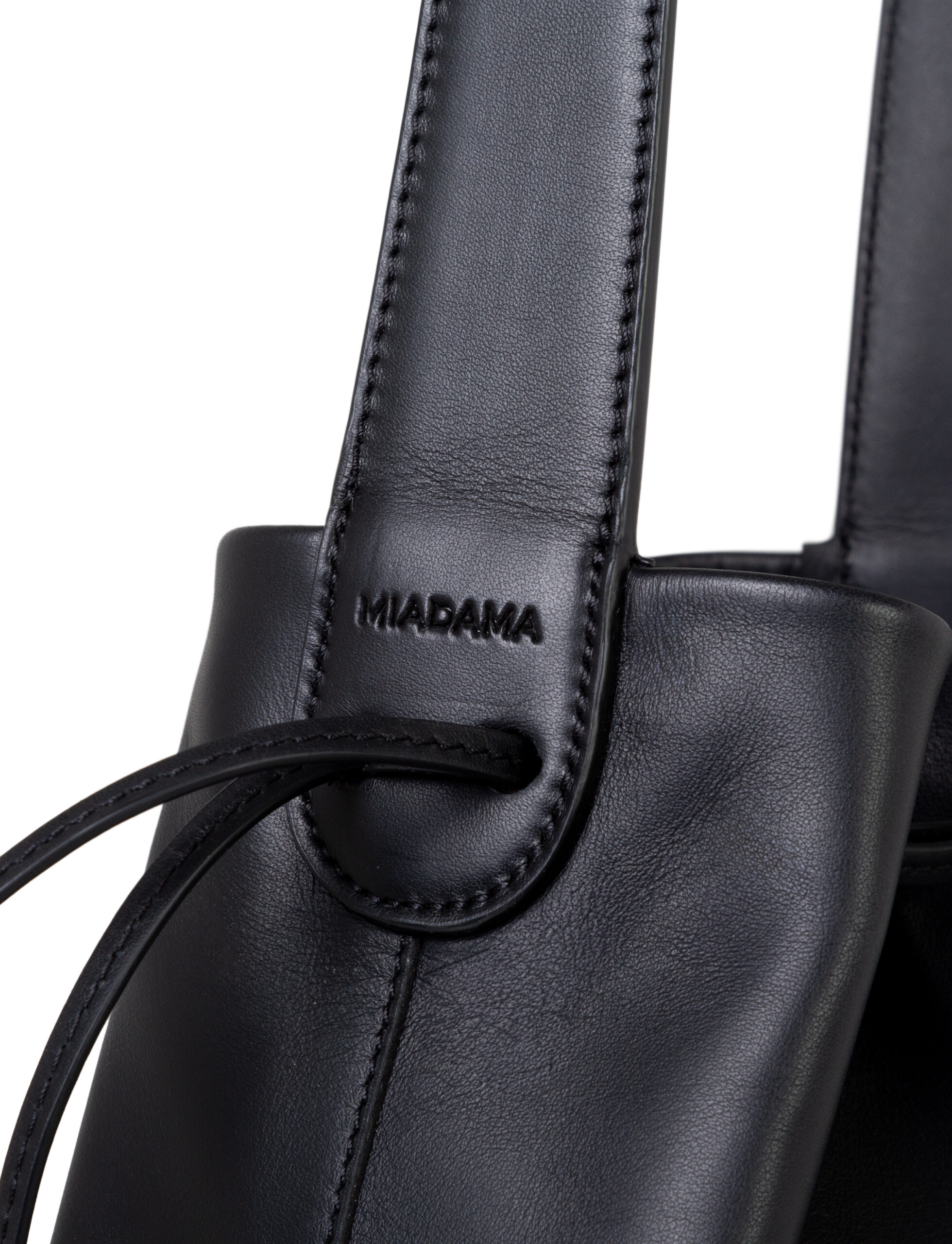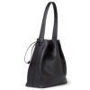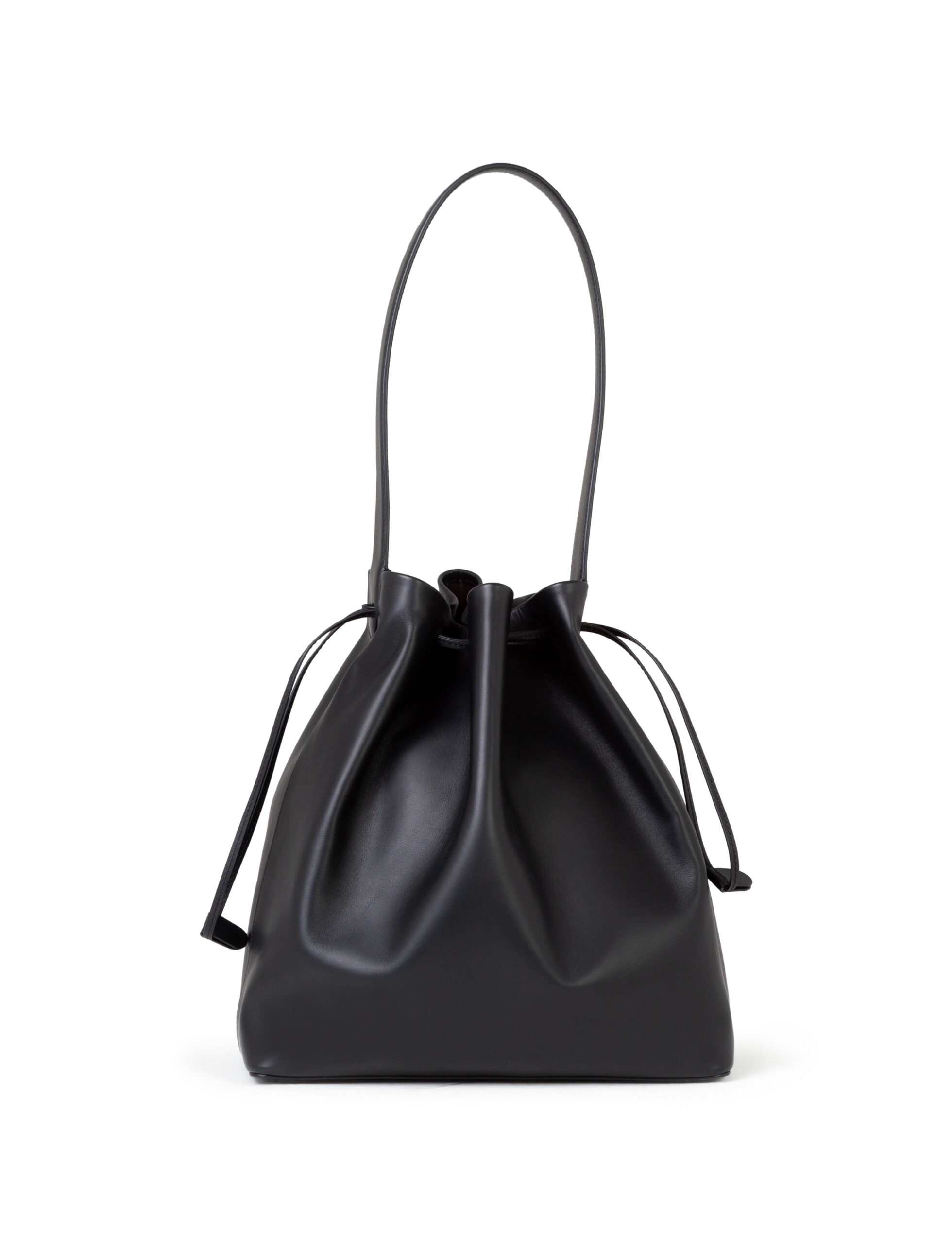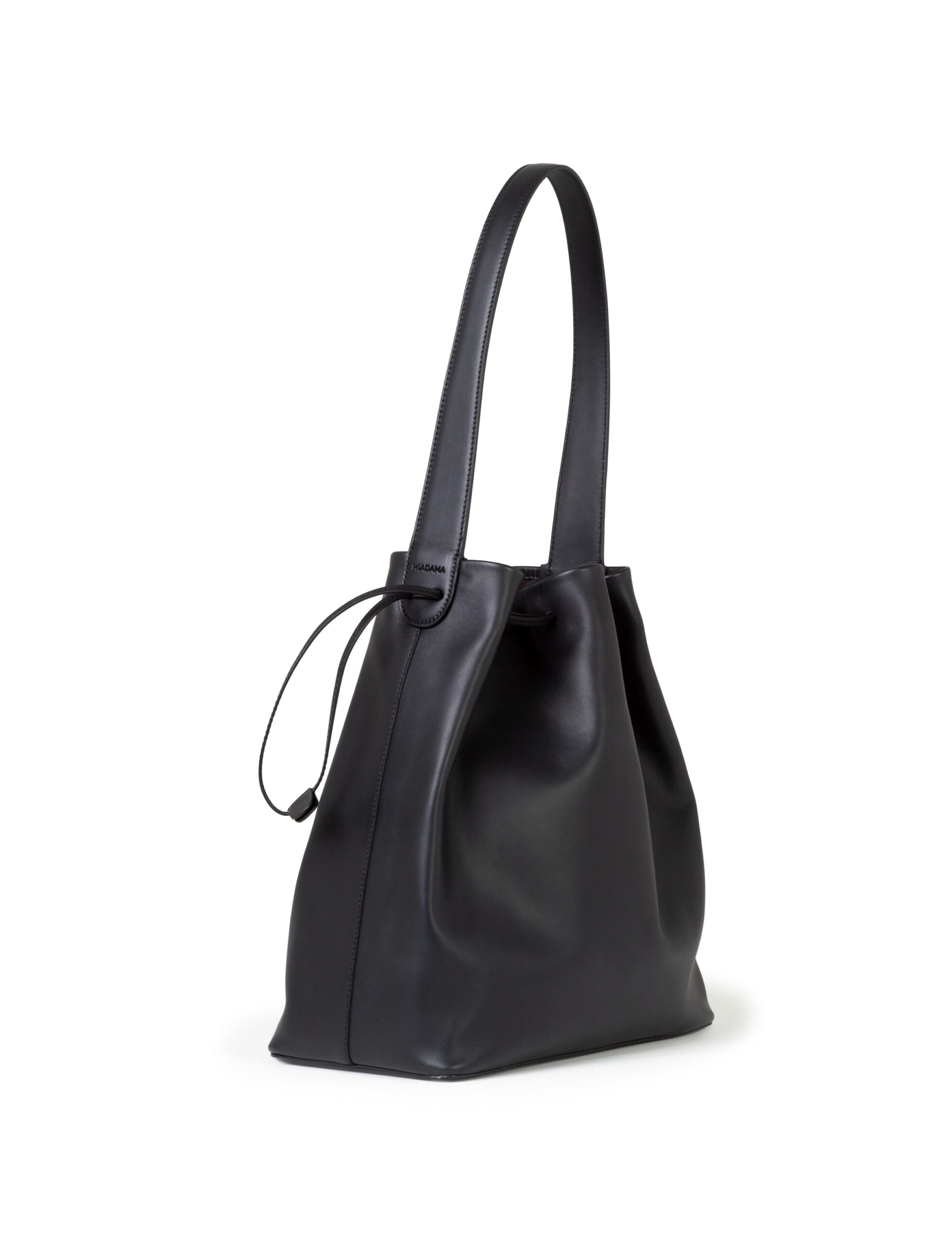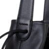 Borsa a sacchetto in pelle nappa colore nero. Fodera in tessuto beige. Chiusura con lacci in pelle. Manicotto in pelle sganciabile. Tracolla a spalla in pelle regolabile. Charms con moschettone sganciabile incluso. Accessori oro.